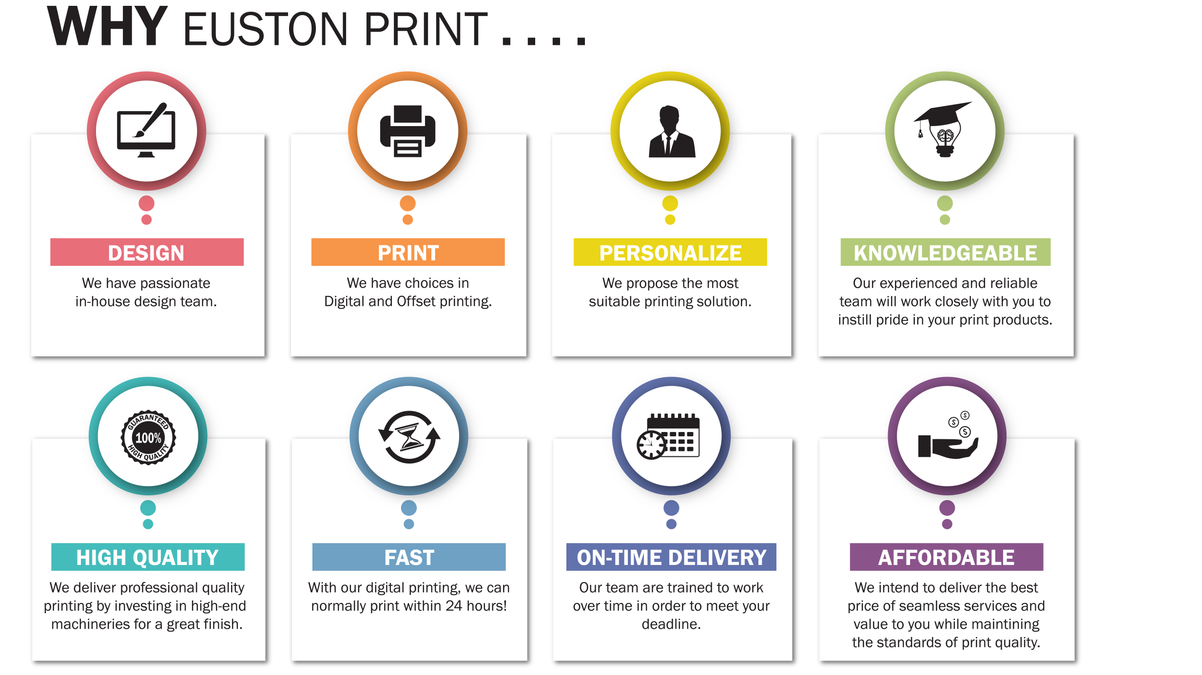 Euston Print Sdn Bhd is a one-stop printing house offering a full range of solutions for anyone looking to succeed in their advertising endeavours. We are driven to provide design and printing solutions that will help you make the greatest impact possible to build your brand and increase awareness.